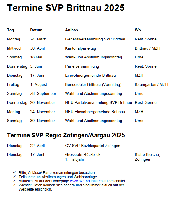 Im Namen der SVP Ortspartei Brittnau und als Präsident möchte ich euch beiden ganz herzlich zu eurer (Wieder-)Wahl in den Grossrat gratulieren. Es ist grossartig, dass ihr erneut das Vertrauen der Bevölkerung gewonnen habt und unsere Region im Grossen Rat vertreten werdet.
